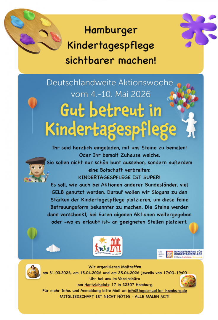 Der Hamburger Tagesmütter und -väter e.V. ist die offizielle Interessenvertretung der Hamburger Kindertagespflegepersonen. Bereits seit 1973 beraten und unterstützen wir Eltern und Kindertagespflegepersonen und vermitteln kostenfrei Betreuungsplätze an suchende Eltern in ganz Hamburg.