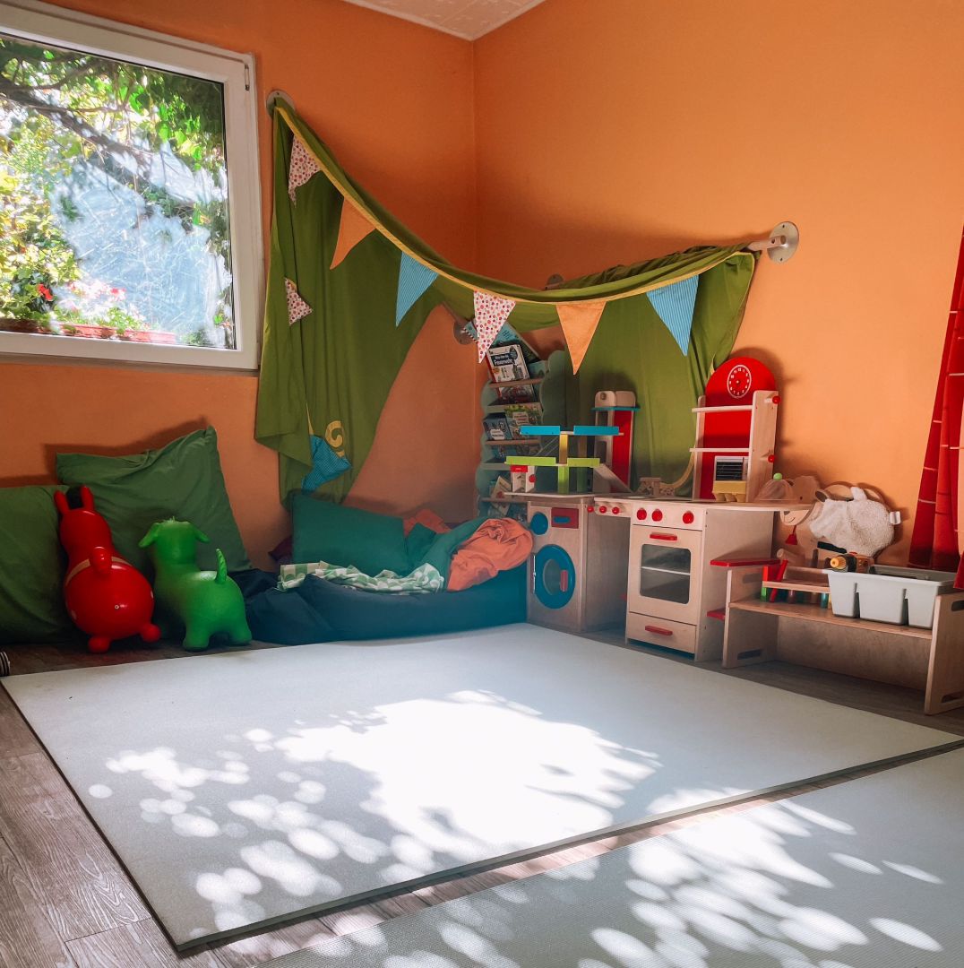 Ein großes Spielzimmer, ein Schlafraum und ein eingezäunter Garten warten auf die Kinder.